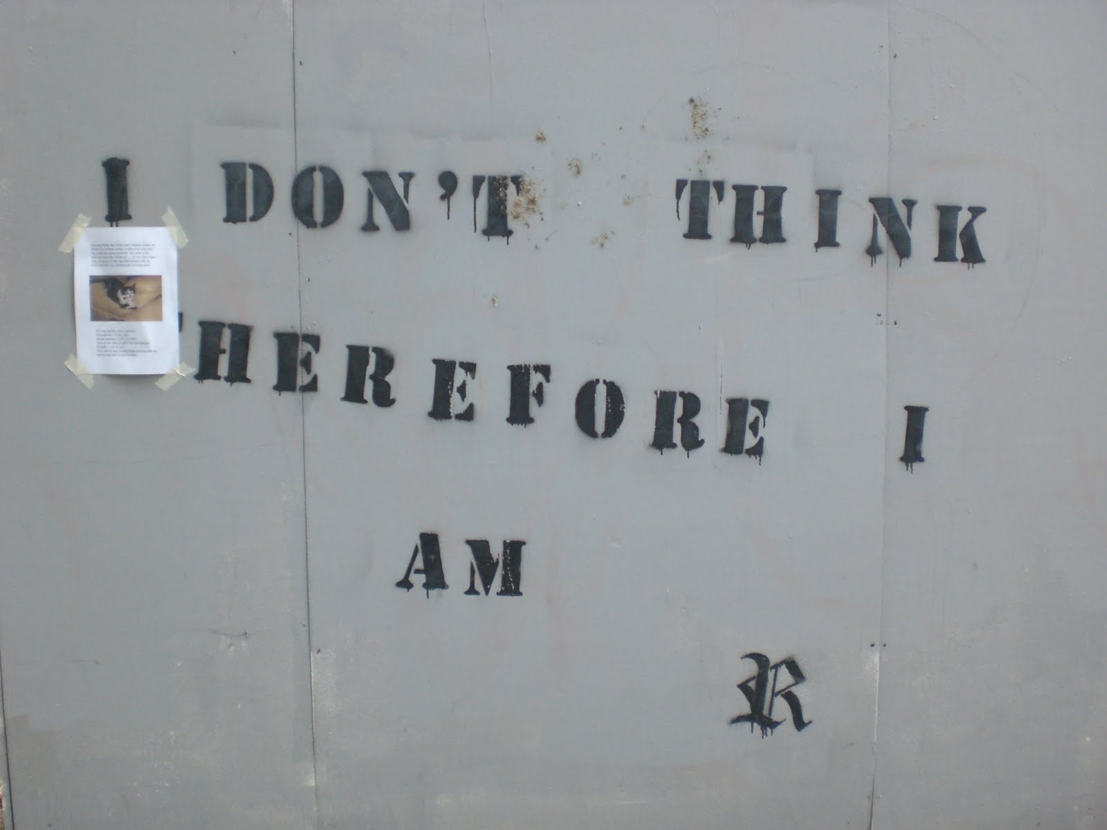 Get off that graffiti, poster about missing cat named Spencer. That is special intellectual Cambridge graffiti and you have destroyed the irony by obscuring the T in therefore. I do not think if Spencer is found he will be able to equal the profound insight into modern society of R’s graffiti, although I admit he is probably more fun and better company. PS I hope Spencer is found soon.